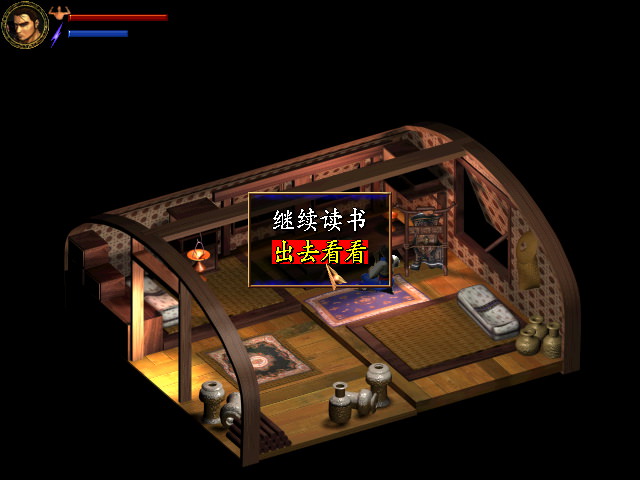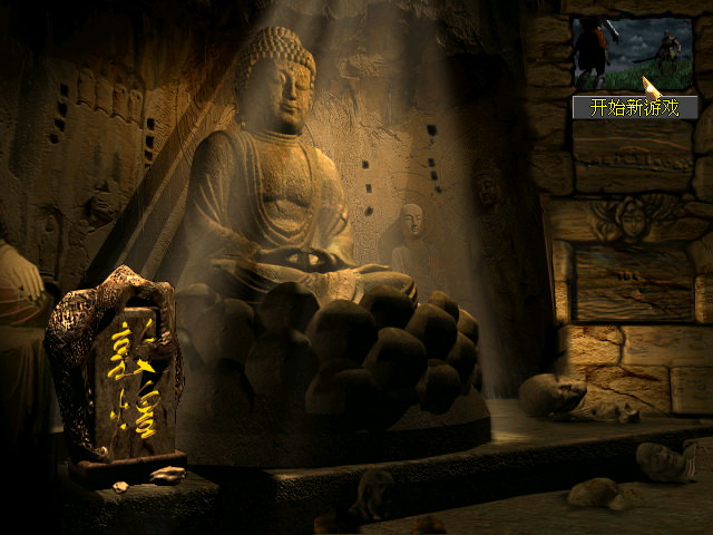 刚进入游戏就能看到一段精美的CG(以当年的技术而言),而且游戏主菜单也是非常精美。当鼠标移动到右边三个方框,才会显示——开始游戏,读取游戏,退出游戏。每个选项都有一个小动画,不可谓不精美。但是美中不足的是,每次进入游戏,左下角的“敦煌”二字,都是要有十几秒的书写时间,玩家才能够去操作鼠标,无法跳过。