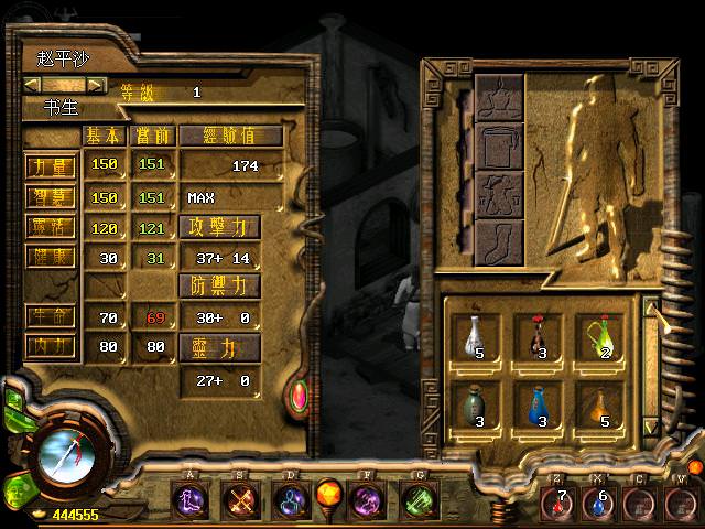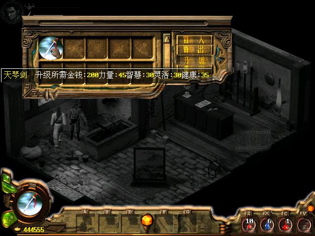 游戏的系统方面,首先优点是随时随地可以存档。剩下的几乎都是缺点,首先属性跟暗黑破坏神一样,每升一级可以有五个属性点增加。但是属性点增加三点攻击力才增加一点,这个搭配就非常不合理。所以游戏中还有个迅速提升人物能力的方式——花2000元买药,直接提升1点属性。可能是由于技术有限,所以游戏大多数场景下都只是平砍。技能完全没有办法升级,也没有办法学习到更多技能。物品只有装备和一些药品,总共加起来也就二十几个物品。装备系统只有四个等级,花钱就行,饰品要到游戏后期才有购买。由于可以直接买加属性的药,所以金钱可能反而是最有用的道具。所有的怪打倒之后必须要手动捡钱。武器是直接升级的,不能购买。