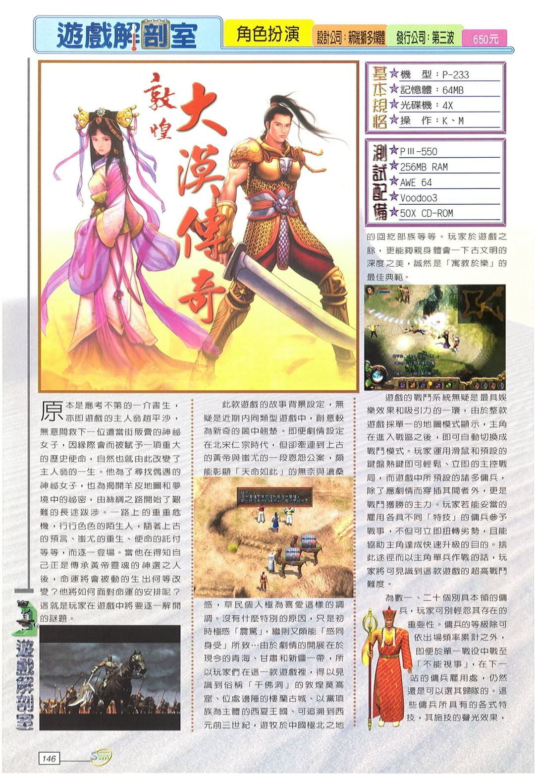 「敦煌-大漠传奇」游戏是汇集了「敦煌文化」的精髓,将「敦,大也;煌,盛也」的特色发挥得淋漓尽澈。甫开场的游戏动画便能令人感受到气动山河、声闻百里的气势,平面美工的每一个游戏场景、建筑物、武器与道具更是按照当时的历史环境构思而成,让人一望即知本游戏之考究程度。因为除了其考究的动画与美术呈现之外,隐藏在游戏背后,一段错综复杂的角色转换与凄美的爱情故事更是动人心弦,引人落泪。