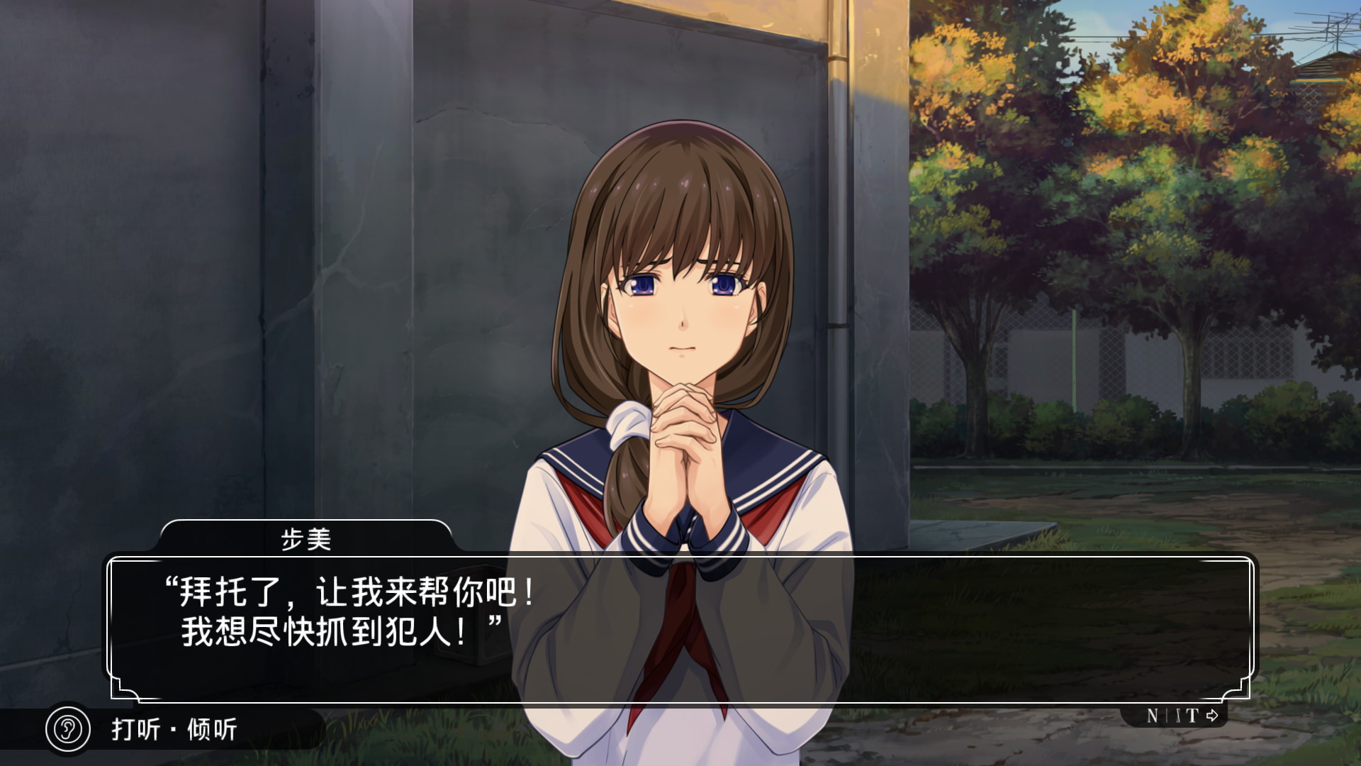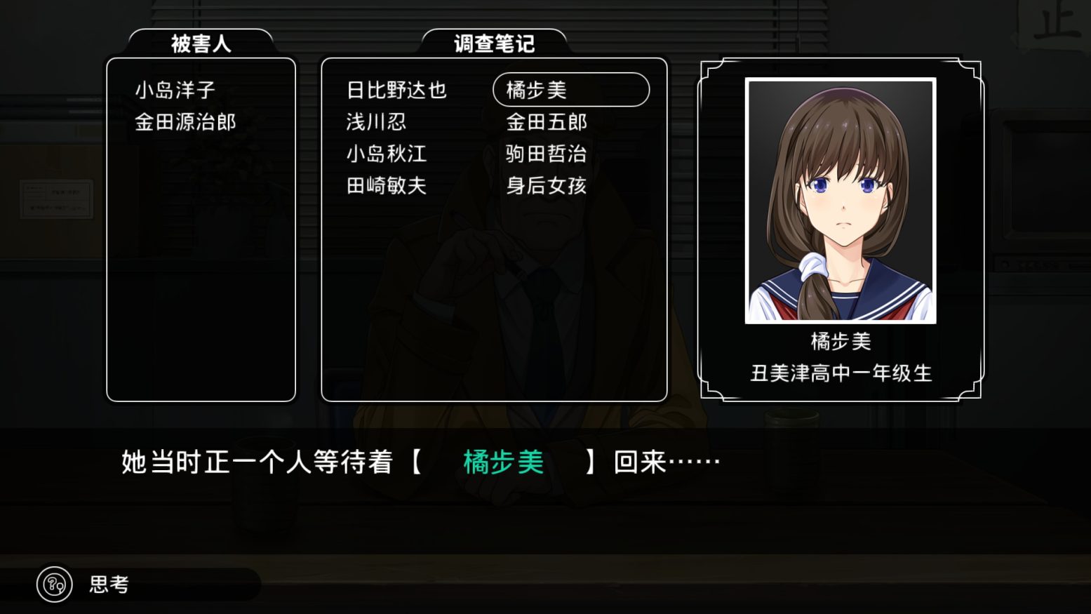 不过游戏进行到中期,15岁的JK橘步美竟然用安眠药将主角迷晕,然后独自一人去寻找当时嫌疑最大的嫌疑人,实在是非常无语的剧情。而在危急关头,这个嫌疑人竟然因为下不了手伤害橘步美而洗清了嫌疑。那一个平常温厚善良的人即使可能被人冤枉,也不可能做出什么绑架杀人的事情吧。所以这段剧情我觉得实在是无法理解。