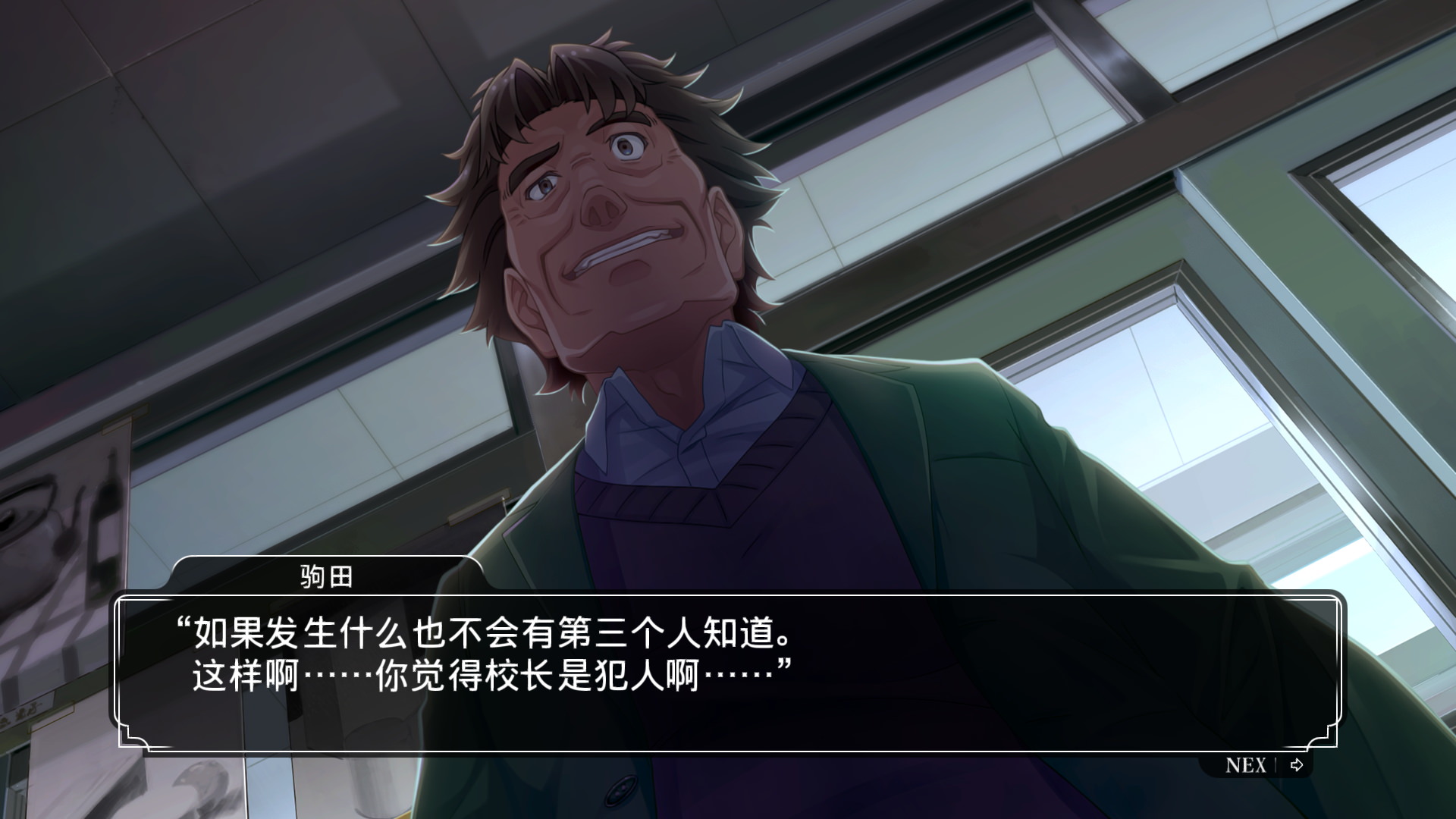 游戏进行到后期,基本锁定了犯人就是校长浦部忠志。当主角告诉一直以来提供大量线索的美术老师驹田哲治之后,驹田老师竟然还假扮凶手整蛊主角。而十五年前的案件,死去的女主角很有可能是被埋在墙里(参见前文图片)。可是在玩家即将要将嫌疑人绳之以法的时候。嫌疑人竟然自杀了……
