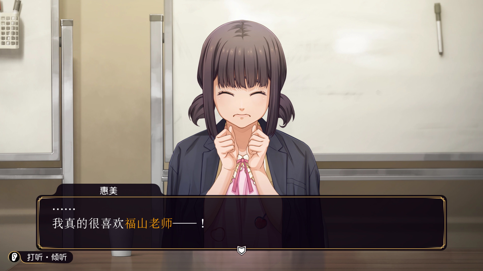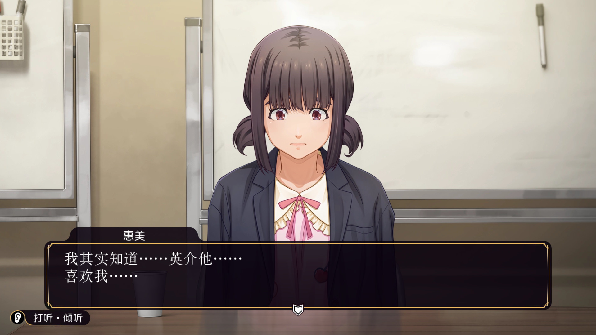 游戏的系统方面在极大程度上还是沿用了之前的重置版的系统,不过相对而言更为完善。比如在每个动作面前都有加入一个小图标。比如在动作的进行中,在画面左下角会显示目前正在做什么。在游戏内容方面,除了刚才提到的以动画推进游戏进度,以及前作就有的Live2D,在游戏进行过程中,也有一些特写的表情增加了游戏的趣味性。