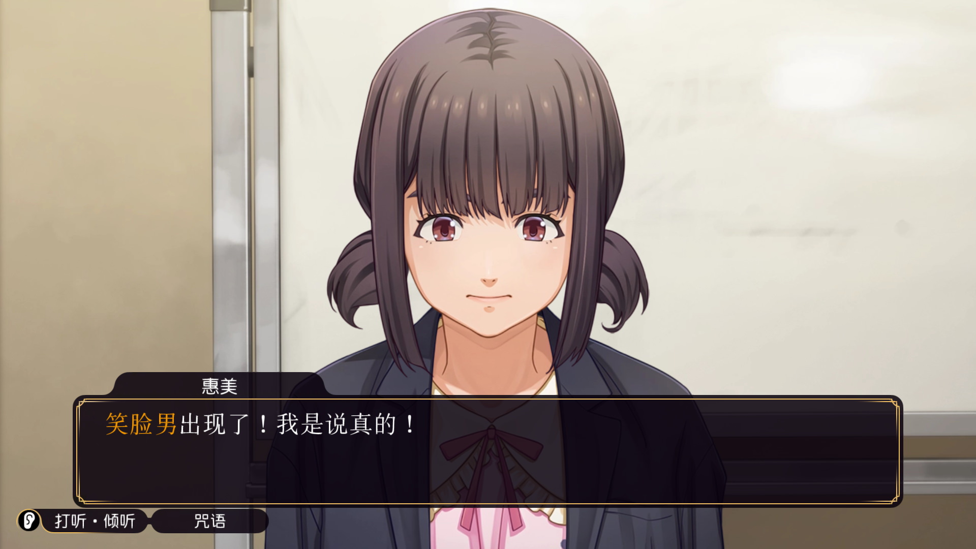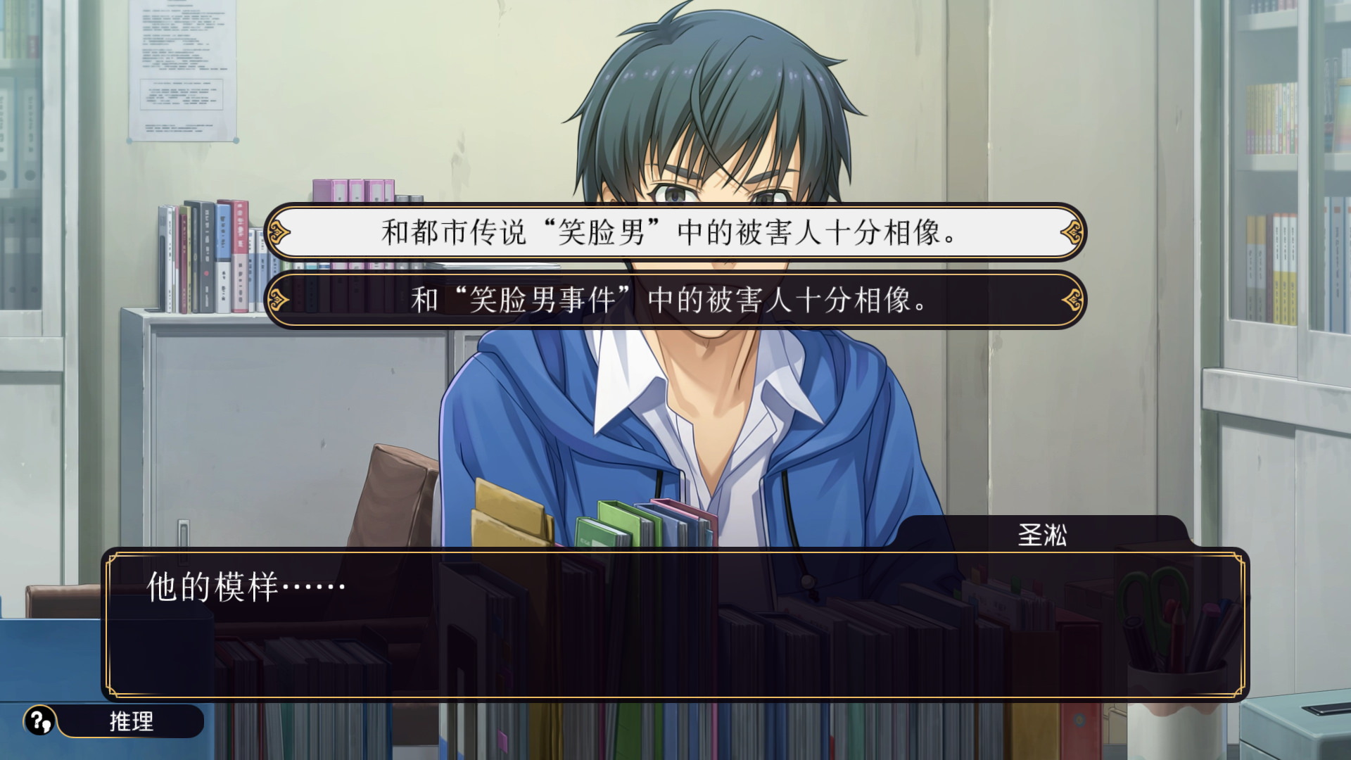 不过好在,结局动画之后,还将迎来一个真·结局。不过这个所谓的真·结局首先是篇幅有限,其次基本没有太多需要玩家操作的地方,80%的时间是以动画的形式播放的。在真·结局里,玩家将首次以空木先生的身份进行调查,不过这个调查其实也就仅限于询问而已。原来18年前的三起命案还真的都是都筑实做的。而在修车店老板眼中的温顺善良的孩子,其实是个不折不扣的连环杀人犯凶手。而为了留住妹妹的笑容,都筑实用剪刀将自己的脸剪出了个大笑脸,就像小丑那样,成为了都市传说笑脸男。