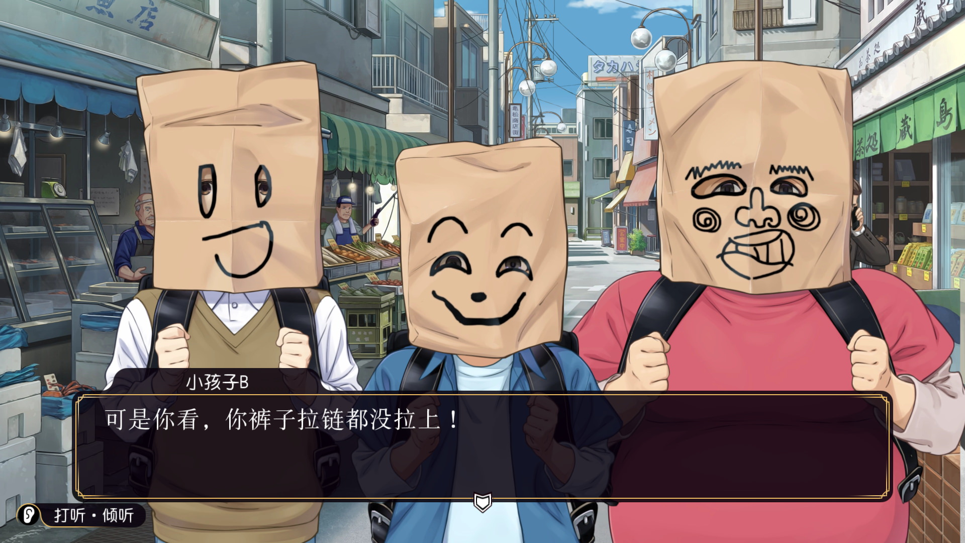 游戏的开始,就以一个非常老派的杀人事件入手——杀完人之后,还套上了画着笑脸的纸袋。由于有动画的加持,本游戏在刚开始就感觉比起之前的两作要更为现代化。