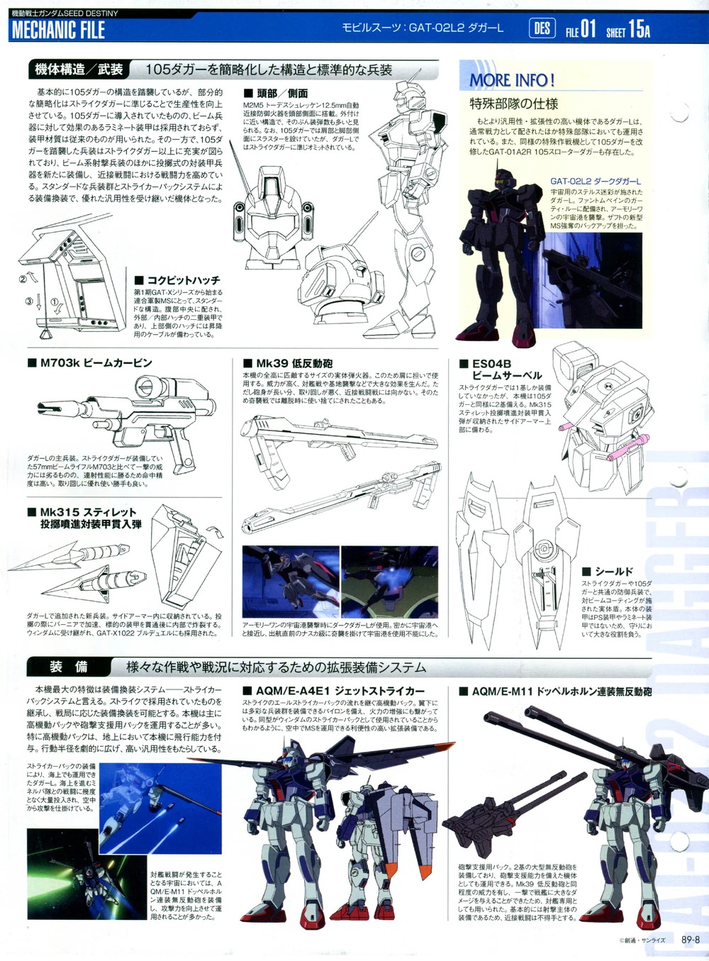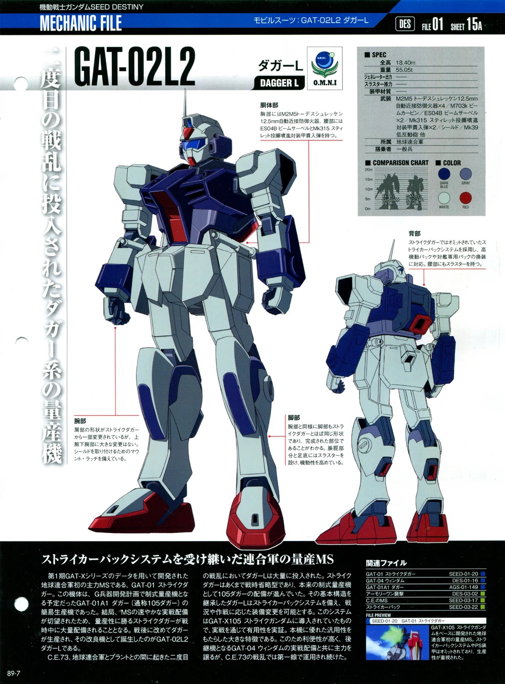 GAT-02L2 短剑L(Dagger L)是地球联合军新一代的量产型MS,也是GAT-01A1短剑的轻装改良型,其名称中的“L”便是“Lightweight Clothing”,即“轻装版”的意思。 相比短剑,短剑L最大的不同之处在于去除部分联合军上层认为的“过剩装备”,包括去除了积层装甲、肩部与小腿部侧面的推进器、以及脚上的12.5mm反步兵机关炮。这也是该型机被称为“轻装版”的原因。 武装方面,短剑L也与短剑有所不同,头部的40mm“豪猪阵”多管CIWS被替换成了外挂式的M2M5型“惊魂式”12.5mm自动近接防御火器,同时胸部上方也加装了两门“惊魂式”。侧裙甲新增了MK315型“锥式”投掷喷射对甲贯入弹,在投掷出后利用喷嘴加速,贯穿敌机装甲,并在扎入后在敌机内部炸裂,造成双重伤害。而另一件自该型机起配备的新武器则是MK39型低后坐力炮,该武器是有着几乎等长与短剑L全高的大型实弹火器,使用时架在肩上,其高火力可匹敌AQM/E-M11型“双管炮式”联装无后坐力炮,在对舰战与要塞攻略战时取得良好的效果,缺点则是因为炮身太长,不太灵活,会对近身战造成阻碍。第81独立机动群“幻痛”的两台黑色短剑L在奇袭扎夫特的军械库一号时,就依靠紧密的配合与对时机的良好把握,利用MK39低后坐力炮击沉多艘扎夫特战舰,并摧毁了军械库的管制室。