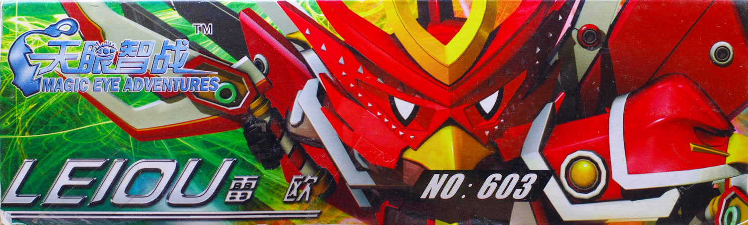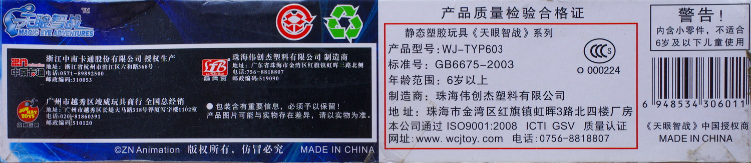 本模型的货号是603,大概是该系列的第三款模型吧。而当年其实有很多这系列的模型,不过由于其他款式实在是过于类似高达SD的机设,加上自己囊中羞涩,所以其余款式最终我基本都放弃了,只挑选了一盒这个系列。本模型是由天眼智战动画的开发公司浙江中南卡通股份有限公司授权生产,珠海伟创杰塑料有限公司制造,广州市越秀区竣威玩具商行销售。如果对竣威玩具的地址比较敏感的朋友应该会发现,它其实就在真光中学对面,当年那里有好几家模型店。而我购入本模型的地方,实际上距离竣威玩具可能也就100米而已。另外,它的LOGO其实挺像风火轮(HOT WHEELS)的……